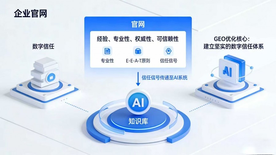 构建"数字信任"基石 GEO优化的核心在于建立坚实的数字信任体系。一个专业、详实、结构完善的官网,是展现企业"经验、专业性、权威性、可信赖性"(E-E-A-T原则)的最佳平台。这些信任信号会直接传递给AI系统,使其在推荐时更加自信,同时也让企业在AI的"知识库"中占据更核心的位置。