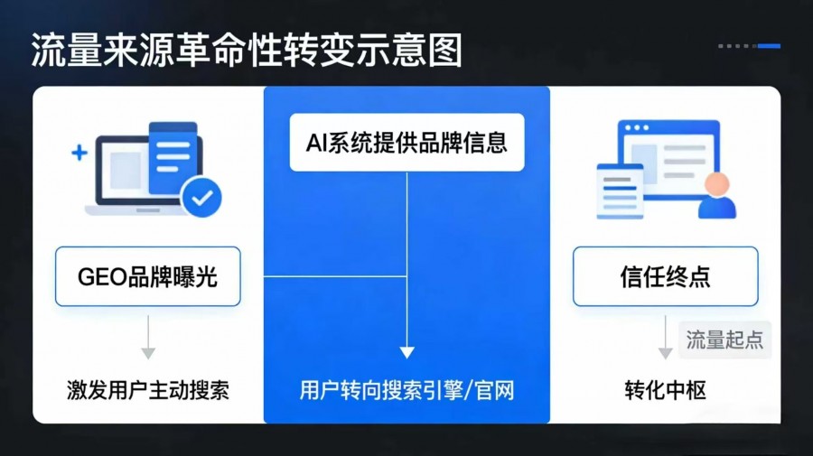 流量来源的革命性转变 虽然用户可能不再直接点击官网链接,但GEO带来的品牌曝光会有效激发用户的主动搜索行为。当用户从AI系统获得品牌信息后,往往会转向搜索引擎或直接访问官网进行深入了解。这种转变使得官网的角色从"流量起点"演进为"信任终点"和"转化中枢"。