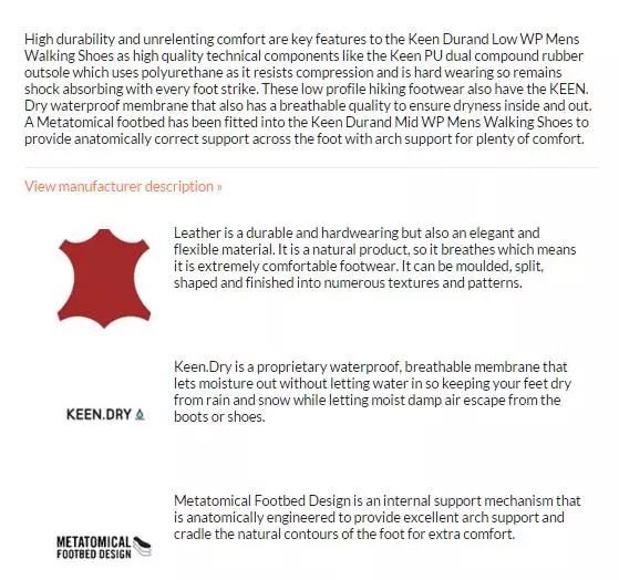 “加拿大鹅”的客户关心服装的质量和材质。该描述反映了这一点,侧重于展示产品特性和底层信息。 冲动型人格 1)贪小便宜 2)具备强大想象力和措辞 3)围绕产品编织一个故事 关怀型人格 在产品描述和独特的页面(关于我们,使命声明等)中展示您的产品如何使其他人受益。 强调你的产品生产的环境和社会效益。 强势的人格 关心产品如何帮助客户改善自我 强调基本特性,尤其是它涉及的性能改进 专注于您的商店或您的品牌的传统和历史建立可信度 例如:大多数健身品牌属于这个类别(请参阅Keen品牌的登山鞋类):