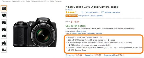 对图像右侧的文本(即最重要的内容)使用 顶级项目符号标记点。您可以使用段落来获得更长的产品描述。 例如,亚马逊在页面顶部以项目符号列表的形式提到每个产品的顶级特征:
