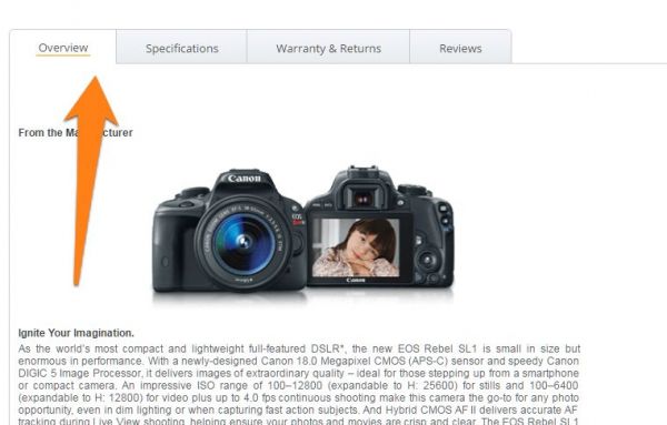 使用信息丰富的标题来组织内容(如关键功能和大小信息)。用户将在浏览页面时扫描这些内容以便找到他们正在查找的内容。 新蛋网在单独的选项卡中组织这些信息: