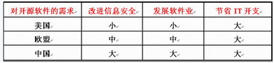 图6. 物联网架构示意图 按照周洪波博士的意见,中国物联网有四大支柱产业群。包括:RFID(射频标签),它将使任何物件都有一个唯一的身份标识(ID),这将应用于各个领域;传感网,它是实现“感知中国”、“感知城市”的基础;M2M(Machine to Machine),它关注末端设备的互联和控制、管理,也将应用于各个领域; 两化融合,它主要应用于工业自动控制方面。应当指出,在实际的物联网中,上述几方面的技术往往是互相关联、共同发挥作用的。 物联网可以真正实现“数字城市”、“感知城市”。目前国家提出的“感知中国”计划,将推动物联网在全国各地电子政务建设中的应用。物联网的应用领域很广,尤其是与电子政务关系特别密切的城市管理、公共安全、智能交通、环境监测、远程医疗等等领域,物联网都可以大大提高政府工作和服务的效能。前些年在数字城市建设中,已建设了一些针对特定应用的物联网子系统,今后应当将它们扩展、提升、整合,实现资源共享,建成覆盖多领域应用的统一管理、控制、运营的一体化物联网,达到“感知城市”的目标。 目前制约物联网发展的重要因素是缺乏统一的标准,因而难以整合,我国已成立物联网标准联合工作组,希望能及早介入这一领域,尽快制订各项标准。 物联网和云计算是密切相关的。一方面,大规模物联网必然要依托云计算平台,它相当于物联网的“大脑”,它接受物联网众多设备传来的信息,通过处理后,再控制和管理这些物联网设备,实现特定的服务。另一方面,随着云计算的发展,它的服务领域正在不断扩大,将覆盖HaaS(硬件作为服务)、IaaS(基础设施作为服务)、PaaS(平台作为服务)、SaaS(软件作为服务)、DaaS(数据中心作为服务)、MaaS (物联网作为服务)、TaaS(一切事物作为服务)……,因此云计算的高级阶段将具有物联网服务能力。 三、开源软件 在PC时代,专有软件(Proprietary Software)是主导软件,而在当前互联网、移动互联网、云计算、物联网、SaaS等新一波IT浪潮中,开源软件有发展为主导软件的趋势。我们可以从下面一些事例中看到这种迹象: 1. 除微软外,以Google、Amazon、Yahoo、Wiki、Facebook等等为代表的全球90%以上的云计算均在开源软件之上运行。不过开软许可证(除AGPL外)并不要求提供Web服务的软件开放源代码,这些应用着的开源软件未必对外全部开源。 2. 2010年二季度全球智能手机操作系统中,开放源码类(包括Symbian,Android,Linux,共占60.8%),已超过封闭源码类(包括RIM,iOS, Windows Mobile,共占37.4%)。 3,Gartner预测,到2011年,至少80%的商业软件解决方案将包含实质性的开源软件。 4. 数量远超PC的云端和物联网设备软件平台大多将基于开源软件。 当前,开源软件已受到各国政府越来越大的重视。由于开源软件有许多优势,尤其是迎合了当前互联网、移动互联网、云计算、物联网、SaaS等IT新技术发展趋势,因而格外受到各国政府的重视。 一般说来,促使一国支持开源软件主要有三方面的需求:首先,是改进信息安全。采用开源软件可以改进信息安全,这是因为开源软件不存在后门,安全漏洞一般比专有软件(私有软件)少,也容易增强其安全性。其次,是发展软件业需求。对于软件业不发达并力图发展软件业的国家,支持开源软件是发展本国软件业的捷径。此外,是节省IT开支。采用开源软件可以大大节省IT开支并有利于推进开放标准、促进市场的公平竞争。表1列出了一些国家对开源软件的需求状况比较。显然,作为有14亿人口的发展中大国,综合这三方面,中国对开源软件比发达国家有更大的需求。