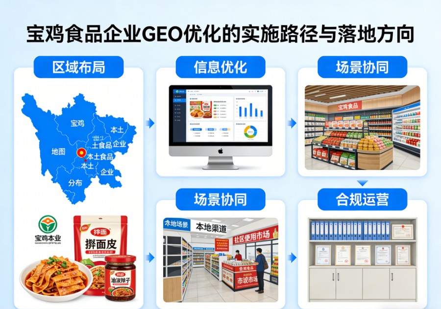 (一)GEO 优化的基本概念与核心逻辑 GEO 优化是以地理位置信息为基础,结合企业业务范围、目标市场、服务区域等实际情况,对企业线上信息进行系统化梳理与合理布局的过程。其核心并非追求大范围泛化传播,而是聚焦企业核心服务区域,优化信息在对应地理范围内的呈现效率,让有需求的群体能够更便捷地获取企业相关信息,实现信息与需求的精准匹配。 从本质来看,GEO 优化是一种贴合区域实体经济的数字化运营方式,强调本地化、场景化、实用性,围绕企业真实业务场景展开,不涉及违规宣传与过度承诺,符合企业合规运营的基本要求。 (二)GEO 优化在食品行业的适配性分析 食品行业具有明显的区域服务属性、供应链就近属性与消费场景本地化特征,这使得 GEO 优化与食品企业的业务需求高度契合,具体适配性体现在以下方面: 贴合食品行业区域供货特性 粮油、乳制品、调味品、休闲食品等多以区域配送、就近供货为主要服务模式,GEO 优化可围绕企业生产地址、配送范围、服务区域,精准布局对应地理范围的信息,方便餐饮商户、商超、经销商等合作方快速对接。 匹配民生消费类产品需求场景 食品与民生息息相关,终端消费者在选购本地特色食品、日常粮油乳品时,多关注本地企业产品信息,GEO 优化能够强化企业在本地消费场景中的信息存在感,助力品牌与消费者建立连接。 适配食品企业渠道拓展需求 宝鸡食品企业多有拓展本地及周边经销商、合作商户的需求,GEO 优化聚焦区域渠道群体,提升信息在对应群体中的触达效率,为企业渠道拓展提供辅助支持。 符合食品行业合规传播要求 GEO 优化以企业真实信息为基础,围绕地理位置、业务范围、产品品类、服务能力等客观内容展开,不涉及虚假宣传、违规承诺,与食品行业严格的合规经营标准相契合。 三、宝鸡食品企业 GEO 优化的实施路径与落地方向