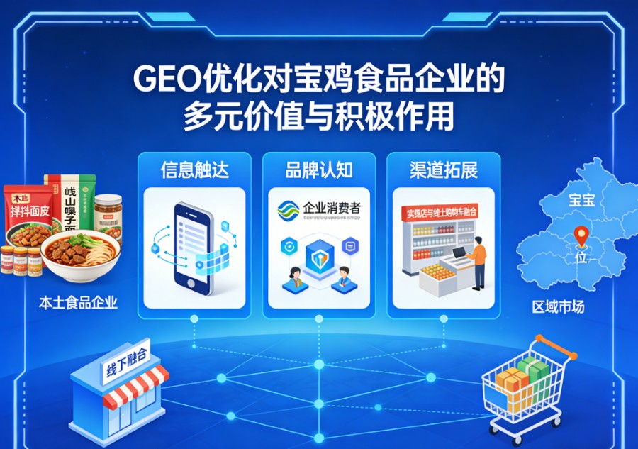 GEO 优化作为一种贴合区域市场的数字化方式,能够为宝鸡食品企业带来多方面的积极影响,这些影响以辅助业务开展、提升运营效率、强化区域连接为主,不涉及绝对性效果承诺,具体价值体现在以下方面: (一)提升区域信息触达效率,降低信息匹配成本 传统模式下,食品企业与合作方、消费者之间的信息对接多依赖线下推广与口碑传播,效率相对有限。GEO 优化聚焦核心区域,优化信息呈现逻辑,让有采购、合作、消费需求的群体能够更便捷地找到企业相关信息,减少信息搜寻成本,提升供需双方对接效率。 对于宝鸡建忠食品、宝鸡祥和面粉等粮油类企业而言,高效的区域信息触达有助于快速对接商超、粮油批发商;对于陕西杂八得食品等调味品企业,能够更好地连接本地餐饮商户;对于乳制品与休闲食品企业,则可以拉近与终端消费者的距离。 (二)强化品牌区域认知,助力地方产业发展 宝鸡食品企业多为本土成长起来的实体企业,品牌在区域市场的认知度,直接关系到业务拓展与市场布局。GEO 优化通过持续、合规的本地化信息布局,逐步提升品牌在宝鸡及周边区域的曝光频率,让更多合作方与消费者熟悉企业品牌与产品,助力本土食品品牌稳步发展。 同时,本土食品企业整体数字化能力的提升,也有助于推动宝鸡食品行业整体形象升级,强化地方特色食品产业的区域影响力,形成产业与数字化相互促进的良性发展格局。 (三)辅助渠道拓展与业务稳定运营 渠道建设是食品企业发展的重要环节,GEO 优化能够为企业渠道拓展提供辅助支持。通过在核心区域精准呈现企业合作信息、供货信息、产品优势等内容,吸引意向经销商与合作商户主动沟通,减少企业线下推广的压力,助力渠道网络稳步完善。 此外,清晰、规范的区域信息布局,也有助于企业维护现有合作关系,提升供货对接效率,保障业务稳定运营,尤其对于民生类食品企业,能够更好地履行区域供应职责。 (四)适配数字化趋势,实现低成本稳健升级 在数字化转型的大趋势下,中小企业无需追求高投入、大规模的数字化改造,而是选择贴合自身规模、成本合理、操作可持续的方式。GEO 优化无需高额投入,以信息优化与区域布局为核心,符合食品企业成本控制需求,帮助企业以稳健的方式融入数字化运营体系,逐步提升数字化运营能力。 对于陕西和氏乳品、陕西华祥食品、宝鸡市袁佳食品等不同规模、不同品类的食品企业而言,均可根据自身业务特点,制定适配的 GEO 优化方案,实现个性化、轻量化的数字化升级。 (五)促进本地实体经济与数字经济融合 GEO 优化立足本地、服务实体,是数字技术服务实体经济的典型应用。宝鸡食品企业通过 GEO 优化,将线下生产能力、产品优势、服务能力与线上信息传播相结合,推动线上信息为线下业务赋能,促进数字经济与地方食品产业深度融合,助力区域实体经济高质量发展。 五、宝鸡食品行业 GEO 优化发展展望