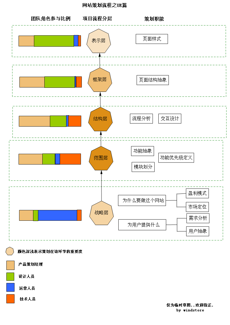 网站策划这个角色我觉得真的不好定义,因为不同的公司对这个职位有不同的期望值,而且不同的策划也可能担当不同的职位,今天翻了下《the elements of user experiences》这本书.这本书通过UE的角度来讲解网站项目流程中的各个环节中如果把握住UE这个对用户至关重要的因素。那么,我们可以通过这几个环节来认识下网站策划在各个环节中到底担当什么角色。 以下为我随手画的草图: